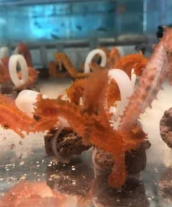 Lined Seahorse, is considered by many hobbyists to be the most attractive of all the seahorses. These are young and the size is about 2-3 inches. The coloration of these tank raised seahorses range from shades of black, to gray to brown. Their coloration may change in the aquarium, and is highly dependent on the colors of its environment.  As they mature and become ready to mate the male lined seahorse dance around, show off his pouch and may have color changes.  If the female is interested they will tangle tails and dance as she deposits up to 600 eggs in his pouch.  It usually takes about 2 weeks then the male will birth as many 50 to 400 babies.